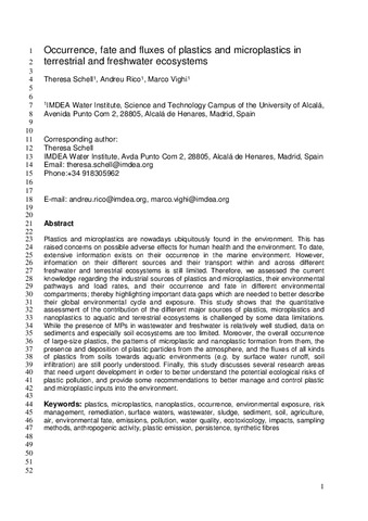 Schell, T. and Rico, A. and Vighi, M. (2020) Occurrence, Fate and Fluxes of Plastics and Microplastics in Terrestrial and Freshwater Ecosystems. Reviews of Environmental Contamination and Toxicology, 250. pp. 1-43. ISSN 0179-5953