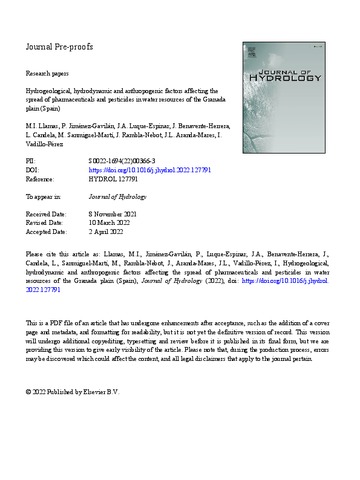 Llamas, M.I. and Jiménez-Gavilán, P. and Luque-Espinar, J.A. and Benavente-Herrera, J. and Candela, L. and Sanmiguel-Martí, M. and Rambla-Nebot, J. and Aranda-Mares, J.L. and Vadillo-Pérez, I. (2022) Hydrogeological, hydrodynamic and anthropogenic factors affecting the spread of pharmaceuticals and pesticides in water resources of the Granada plain (Spain). Journal of Hydrology, 610. p. 127791. ISSN 00221694