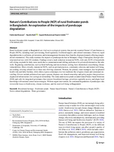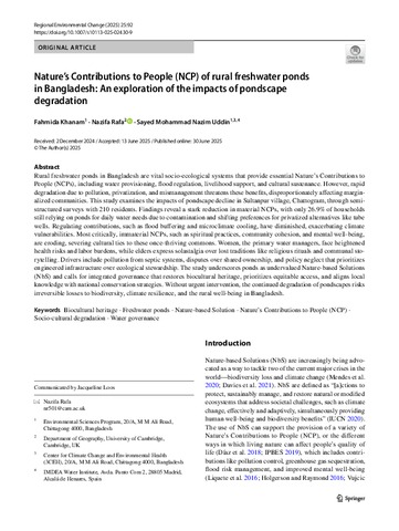 Khanam, F. and Rafa, N. and Uddin, S.M.N. (2025) Nature’s Contributions to People (NCP) of rural freshwater ponds in Bangladesh: An exploration of the impacts of pondscape degradation. Regional Environmental Change, 25 (92). pp. 1-12.