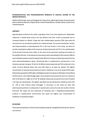Akhrimenko, V. and Rodríguez Gil, J.L. and Rico, A. and López-Heras, I. and Lertxundi, U. and Martínez-Morcillo, S. and Motas, M. and Mozas-Blanco, S. and Santos, O. and Orive, G. and Valcárcel, Y. (2026) Pharmaceuticals and transformation products in coastal waters of the Iberian Peninsula. Marine Environmental Research, 213. pp. 107675-107691. ISSN 0141-1136