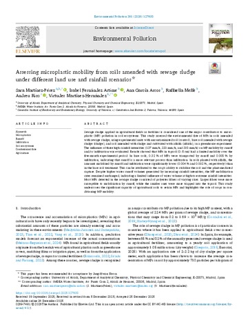 Martínez-Pérez, S. and Fernández-Artime, I. and García-Arcos, A. and Meffe, R. and Rico, A. and Martínez-Hernández, V. (2026) Assessing microplastic mobility from soils amended with sewage sludge under different land use and rainfall scenarios. Environmental Pollution, 391. p. 127608. ISSN 0269-7491