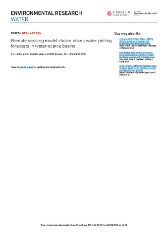 Jaafar, H.H. and Hazimeh, R. and Sapino, F. and Pérez-Blanco, C.D. (2026) Remote sensing model choice drives water pricing forecasts in water-scarce basins. Environmental Research: Water, 2 (1). 015005.